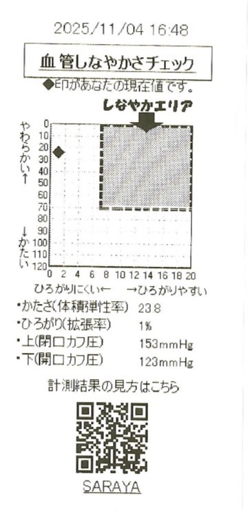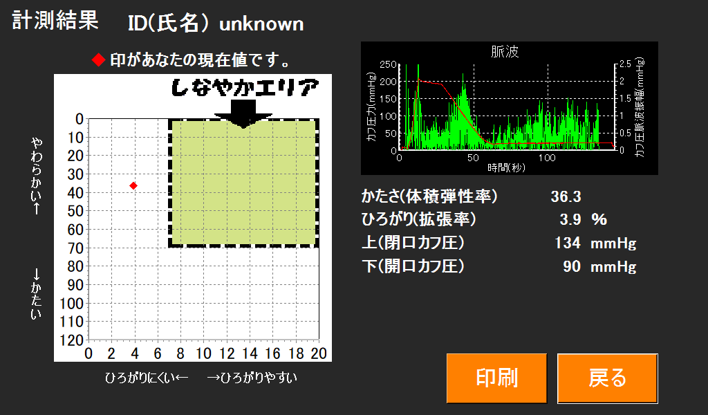 2分30秒で自己測定することができ、測定結果は『しなやかグラフ』としてプロットされ、機器に付属するプリンターで印刷も可能です。
